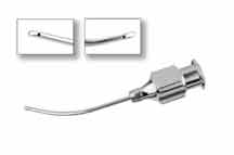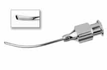 Both cannulas have a flattened and curved cannulated neck. The Masket Sub-Tenon Cannula features dual 0.3-mm distal ports for forward and lateral dispersion of anesthesia. The Rhein Sub-Tenon Cannula features a single distal port for forward dispersion of anesthesia.