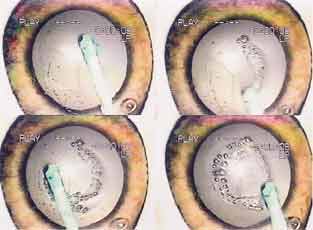 When using viscoelastic, you may observe cavitation bubbles during incisions. Employing a viscoelastic such as Occucoat will help to minimize these, but more experienced surgeons will find that the bubbles aren't a serious problem. - Repairing tears. If a tear in the capsule occurs during surgery, simply make an incision with the Fugo Blade perpendicular to the acute tearing edge. The new incision will act as a bulkhead barrier, stopping the spontaneous tearing. (Because you may want to enlarge the incision or repair an inadvertent tear during surgery, it's advisable to leave the handpiece in the sterile field even after the capsulotomy is complete.)