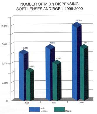 For M.D.s, the number of pa-tient visits for soft contacts grew from 3.67 million to 5.34 million between 1999 to 2000 -- an im-pressive increase of 45.4%. (The number of lenses sold increased by 68.3%.) The number of office visits to M.D.s for RGP lenses increased even more: 58.6%.