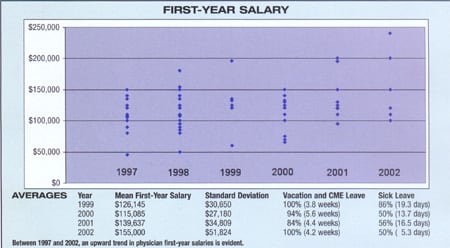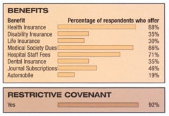 The Health Care Group, Inc. conducts an annual Physician Starting Salary Survey that contains such information. Data from the 2002 survey on first-year base salaries, benefits, malpractice insurance and restrictive covenants appear below.