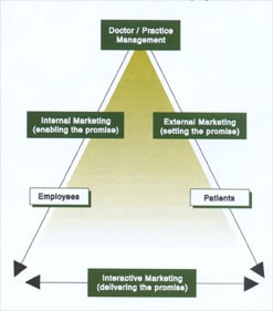 To fully understand how an integrated marketing strategy affects a medical practice, we need to define the components of marketing. To do this, we can use a management tool known as the Marketing Triangle. (See accompanying diagram.)