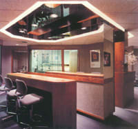 In this practice, the problem of a low ceiling and a ceiling air conditioner was solved by installing a bronze mirror outlined by feature lighting. Optical dispensing and reception are back-to-back, creating an open, functional dual-purpose island. |