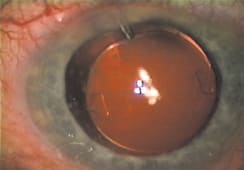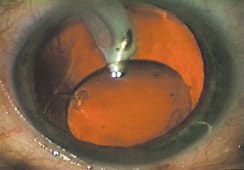 Some beginning phakic IOL surgeons are worried about only having that narrow 3 or 4 mm in the anterior chamber to work in, as opposed to the whole depth of the bag in an aphakic case. As a result, they may put in too much viscoelastic under too high a pressure, causing it to squish out into the trabecular meshwork. And once they get the lens in, they're so happy that they don't want to go back and get all the viscoelastic out. They're afraid the chamber will collapse.