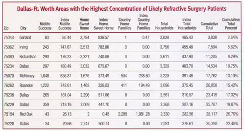 Plan office and seminar locations. If you're working with MicroVision, it's possible to generate maps and lists based on market segmentation that show geographically where the highest concentrations of particular segments reside. (For an example, see "Dallas-Ft. Worth Areas with the Highest Concentration of Likely Refractive Surgery Patients," on this page.) Such a list would show where a practice could expand or where informational seminars should be presented. If you co-manage, the list would indicate where you should establish a co-management partner.