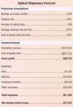Assessing future results. The table on page 116 provides an example of a budget forecast projecting the economic impact of adding a new optical dispensary to a practice. The analysis includes the number of expected jobs, the expected revenue rate and cost of goods sold per job, as well as operating expenses that will probably be generated by adding the dispensary. (The category "other expenses" includes items such as build-out costs, equipment and display cases.)