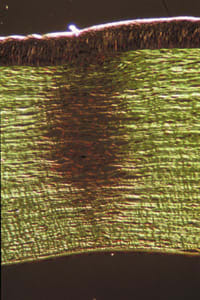 Treatment for hyperopia is applied in a symmetrical ring pattern outside of the visual axis; it produces a flattening of the peripheral cornea and steepening of the central cornea. The number of CK spots applied to treat hyperopia ranges from eight to 32, with an increasing number of spots applied for increasing levels of hyperopia. Because the zone of collagen shrinkage is deep (see image, page 82), the resulting shrinkage and corresponding change in vision is long-lasting, with minimal regression.