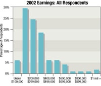 In the midst of tumultuous political changes and economic uncertainty (not to mention a steady stream of new technological and drug-related options) many practices hit new earnings highs in 2002. However, others didn't fare as well. Reported changes in personal income between 2001 and 2002 ranged from a drop of $600,000 to a gain of $2,000,000. (Nine percent of those responding reported an income drop of at least $100,000; an equal number saw their income grow by $100,000 or more.)