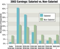 We also analyzed the data by income range to see if there were any clearcut correlations to years in practice, hours worked per week, or change in income between 2001 and 2002. Those in the higher income brackets did tend to have been in practice longer, but there was no clear correlation between income and number of hours worked.