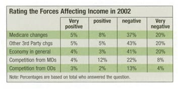 However, some doctors reported that management and efficiency changes were only helping to offset decreasing reimbursements, and wondered how long they could keep it up. "Production increases have helped us maintain our income level, but overhead continues to increase while payments are decreasing. It will be very hard to increase production further." REFRACTIVE SURGERY Although some practices offering refractive surgery did much better in 2002, others took a financial beating. Reasons offered included significant competition from discount corporate LASIK providers and the high cost of marketing the service. Others felt the economy was to blame. One doctor added: "My outlook for 2004 is pessimistic." While many refractive surgery practices did better in 2002 than 2001, most of these doctors offered no specific reason. However, one doctor did say that he felt his practice benefited from a decrease in negative publicity about refractive surgery. THE LAST WORD A few doctors offered general philosophical comments that undoubtedly reflect the feelings of many other M.D.s in the field -- some positive, many negative. On the down side: