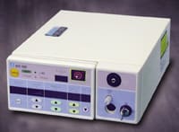 The E2 unit contains a video camera, xenon light source, and a semiconductor diode laser tuned to an 810-nm wavelength. The power console features adjustable laser output, pulse width, light and aiming beam intensity.