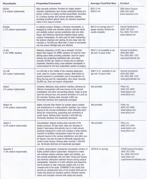 With so many new procedures emerging, including bimanual phaco, endocyclophotocoagulation, nonpenetrating glaucoma surgery, phakic IOLs, and refractive lens exchange, it's likely that new viscoelastic agents to complement them will be developed. In the meantime, for your convenience, we've listed today's state-of-the-art products here, with a focus on their uses in cataract surgery.