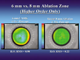 LASIK. The patient on the left had a 6-mm ablation zone, and the presence of spherical aberration is obvious by the ring of yellow/red in the periphery indicating an area of more myopic refractive error. On the right is a more recent 8-mm ablation zone with virtually no spherical aberration. Total higher-order aberrations are 4 to 5 times more in the 6-mm ablation