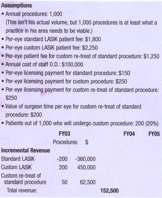 However, practices that have begun to formulate financial plans for custom aren't necessarily counting on an increase in volume. Instead, they expect to be able to recoup their costs by charging a premium fee, up to $500 more per eye than they're charging for standard LASIK. (See "Working with the Numbers," on page 81.) Scott Hyver, M.D., for example, who practices in the competitive San Francisco Bay area, is transitioning to custom based on these numbers: