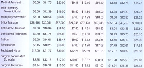 About this data: The staff salary national averages in this installment of Stat Tracker were drawn from The Health Care Group's 2003 Staff Salary Survey. In the fourth quarter of 2002, questionnaires were mailed to 8,800 medical practices nationwide. Approximately 1,100 practices responded, including 146 ophthalmology practices. The complete 2003 Staff Salary Survey, with more staff categories and additional results, is organized by staff position and geographic region. For more information about the survey, call Mark E. Kropiewnicki, J.D., LL.M., at (800) 473-0032.