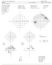 Her IOP OS remained in the high 20s over the next year and a half; testing revealed development of a superior arcuate defect in her left eye (see visual field, above.) OCT3 also revealed inferotemporal thinning of the nerve fiber layer in the left eye, with normal values in the right eye.