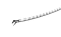 The Ikeda Super Micro Capsulorrhexis Forceps (AE-4385) allow consistent, flawless capsulorrhexis construction. The slim 23-gauge curved tip easily fits through the 20-gauge incision with the jaws closed. Once inside, the jaws open sufficiently to pinch the anterior capsule and initiate a smooth tear. (Alternatively, the closed jaws can be used to pierce the capsule as one might with a bent needle cystotome.) The micro platforms incorporated into the tips permit exquisite tissue control; the curved arm of the forceps and round handle facilitate finger manipulation during completion of the rhexis. At the same time, the distal location of the tips insures that no edges snag the inner margin of the corneal incision when the tear is brought around into the subinicisional region.