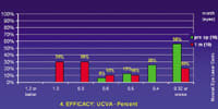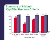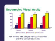In terms of key effectiveness criteria, the FDA requires that a minimum of 85% of patients have post-op visual acuity of 20/40 or better; 100% of patients in the VISX trial are 20/40 or better at 6 months. Moreover, 50% of the patients have to be within .5D of the targeted manifest refractive spherical equivalent and 75% within 1D; 95% of patients in the trial were within .5D at 6 months, and 100% were within 1D.