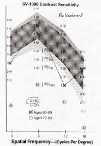 ► If a patient comes in with a small posterior subcapsular cataract and says he's blinded by bright light, it wouldn't be unusual for him to test 20/20 on the Snellen acuity chart. So, that gives the doctor no information about the difficulties he's experiencing. "But if the patient undergoes a contrast sensitivity test and there's a reduction on the 6 cycles per degree grid, that positively confirms the problem."