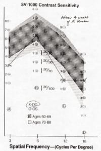 Glenn Pomerance, M.D., regularly measures contrast sensitivity in most of his patients. Here he shares three cases that illustrate how it can be helpful. Case 1: Glaucoma Treatment Assessment Contrast testing reveals a 12 cycles per degree "notch" in a 61-year-old African American male with a family history of glaucoma, early visual field abnormality and topographic evidence of nerve damage. (See images below.) After treatment with a beta blocker for 4 weeks, and a reduction in IOP from 26 mmHg to 19 mmHg, there is some normalization of the notch. A prostaglandin is added; pressure decreases to 15 mmHg; and the notch is normalized, indicating likely satisfactory control of the glaucoma.