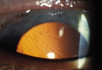 Examination: Examination revealed a peripheral retrocorneal membrane on the superior cornea. (See photographs, below.) Gonioscopy revealed epithelialization of the angle and formation of peripheral anterior synechiae (PAS). The diagnosis of epithelial downgrowth was confirmed with argon laser photocoagulation.