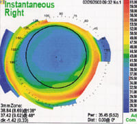 Working toward that goal, researchers using the Nidek EC-5000 excimer laser around the world, including Paolo Vinciguerra, M.D., of Italy, and Arturo Chayet, M.D., of Mexico, have been performing what they call aspheric ablations. They've discovered that using an optical zone of 5 mm and a transition zone of 9 mm pushes the "red ring" much farther out, increasing the effective optical zone, and maintaining a more prolate corneal shape. (The EC-5000 has adjustable optical and transition zones. The function between the zones is close to linear, so the depth of the transition zone changes depending on the depth of the ablation.)