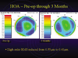 One of the LASIK patients Dr. Salz treated outside of the clinical trial was a 26-year-old police officer who was originally treated with a broad-beam laser and a 5.5-mm optical zone. His post-op refraction was -0.50 -0.50 x 180 OD and -0.50 -0.75 x 180 OS; acuity in each eye was 20/20. But high levels of spherical aberration and coma were detected by the LADARWave. He complained of "halos, ghosting and doubling," at night. He was using pilocarpine and Alphagan to help control his symptoms. On Feb. 27, Dr. Salz re-treated this patient's left eye, and on April 8, his right eye was re-treated. "He did great," Dr Salz said. His wavefront results for the left eye are pictured to the lower left. Since the FDA approved the VISX CustomVue platform, Robert Maloney, M.D., has used it to perform 15 therapeutic procedures. "It's been remarkable how much therapeutic wavefront treatment has produced an improvement in patients' subjective symptoms," he said. In one of his cases, a 6.25D myope underwent a primary standard LASIK procedure on his left eye, after which he was 20/15 with a refraction of -1.25, -0.50 x 75. After a subsequent enhancement, he complained of poor quality of vision and glare. BSCVA was 20/38 and UCVA was 20/40. Refraction was -0.50, -0.25 x 115. In November 2002, Dr. Maloney performed a therapeutic CustomVue treatment. Three weeks later the refraction was +0.50, -0.25 x 170. By 3 months post-op, the patient reported improvement in his quality of vision; UCVA was 20/32 and BSCVA was 20/20. Dr. Salz recommends that surgeons who are performing therapeutic custom procedures off-label not operate on both eyes at once. "I think if you're careful about who you select, you'll probably do OK," he said. "Do the worst eye first and make sure patients understand that although this is advanced technology, it's not approved for this use on any platform. It represents an off-label use of the laser, and they have to be willing to accept that." -- Ophthalmology Management |