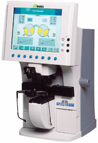 With the Spectrum 2, you have two methodologies to measure lenses. The newest method uses wavefront technology (700 data points) to analyze and measure all types of spectacles, "eliminating all panascopic tilt." The other method is that of the traditional (4-data point) auto lensmeter, with reproducible measurements accurate to 0.01D.