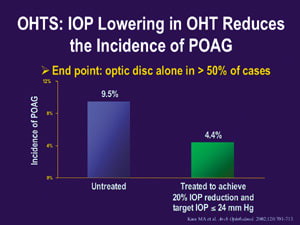The major implication of the OHTS is that lowering IOP can prevent the development of glaucoma in OHT patients. This suggests that many OHT patients should be treated to reduce their IOP and that the benefits of treatment could outweigh the costs for patients at highest risk of glaucoma. Such patients include those with thinner central corneas, higher IOPs, larger c/d ratios or advanced age.