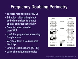 Frequency doubling perimetry (FDP) takes considerably less time than blue-yellow perimetry (2 to 4 minutes per eye) and is useful in population screening for glaucoma. The test, which targets magnocellular retinal ganglion cells, has alternating black and white stripes to detect spiral contrast sensitivity. (See "Frequency Doubling Perimetry.") Although FDP detects defects earlier than SAP, it has only 17 to 19 test locations and limited ability to follow patients over time. The new matrix perimetry uses this technology with 3º targets and may allow us to better follow patients over time.