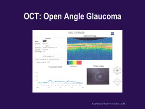 Another useful technology that tracks changes in the RNFL over time by storing still and video images is OCT. Built-in software automatically compares your patients' measurements against those stored in the OCT's normative database, producing charts or graphs that let you detect RNFL abnormalities at a glance. (See "OCT: Normal" and "OCT: Open Angle Glaucoma.")