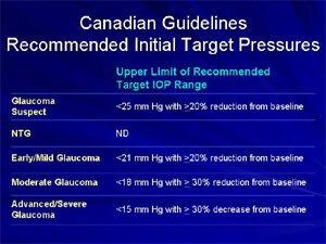 How low is low enough for a target IOP? Unfortunately, there's no "safe" IOP that works for all patients. What we do know is that lower IOPs lower the risk of visual field deterioration in glaucoma patients. The Canadian guidelines for glaucoma management recommend target IOPs below 25 mm Hg for suspect glaucoma and 21 mm Hg for early glaucoma, with at least a 20% reduction from baseline IOP.8 (See "Canadian Guidelines: Recommended Initial Target Pressures.") New evidence from published trials812 shows we should set low target pressures, but we can't guarantee that achieving a desired IOP will stop glaucoma's progression. Instead, we must set separate target pressures for each patient and be sure to modify target IOP when necessary. To adjust target IOP, look for direction from clinical guidelines, practical applications of National Eye Institute trials (offered by professional organizations) and the degree and character of each patient's disease.