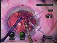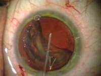 Mackool titanium capsule retractors support the bag in the area of a traumatic zonular dialysis. |