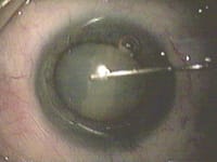 Managing high endocapsular pressure. The milky, intumescent variety of white cataracts more commonly found in younger patients can be especially challenging because they're accompanied by increased endocapsular pressure. In this situation, the initial puncture into the central anterior lens capsule with the needle cystotome lets fluid enter the lens, causing lenticular swelling and elevating endocapsular pressure. This generates forces on the capsule that can produce radial extensions out to the lens equator in two directions, forming an ominous "minus." (See image, facing page, bottom right.)