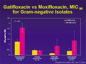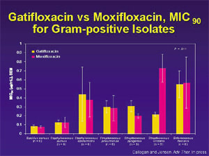 A much larger study looked at in vitro susceptibility of ocular pathogens to gatifloxacin and four other fluoroquinolones. It found the overall susceptibility for gatifloxacin was equal or superior to moxifloxacin in 23 ocular pathogens.6 Gatifloxacin and moxifloxacin both fared well with almost the same efficacy against a variety of organisms. However, gatifloxacin was the best of the drugs studied -- not much different from moxifloxacin -- but undeniably a little better in this study.