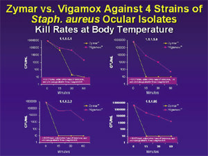 The combination of the potent gatifloxacin molecule with a formulation containing benzalkonium chloride (BAK) provides a more rapid kill of organisms. The kill curves for gatifloxacin are much better than those for moxifloxacin because of the combined effect of the BAK and the antibiotic. If you put an antibiotic on a patient's eye 30 minutes before surgery, you will sterilize it with gatifloxacin, whereas it won't be sterilized with moxifloxacin. In a study by Rupp and colleagues using the commercial preparations of both drugs, the kill rates of gatifloxacin were compared to those of moxifloxacin against four strains of S aureus at room temperature. For all four strains, the concentrations of CFUs of S aureus were reduced faster when exposed to gatifloxacin. This difference in kill rates occurred at all measured time points -- 15, 30 and 60 minutes.