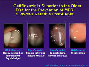 Another study, this one using rabbit models, showed gatifloxacin's superiority over third generation fluoroquinolones for prophylaxis of MRSA after LASIK. Five of seven rabbit eyes inoculated under the flap with 0.1 cc of 1 x 103 MRSA organisms developed infectious keratitis when treated with ciprofloxacin (Ciloxan) or levofloxacin (Quixin). No gatifloxacin eyes developed infectious keratitis.4