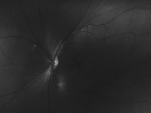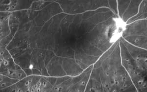 Optomap fluorescein angiogram showing extensive leakage near the optic disc. |