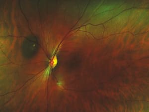 Ultra widefield view shows the retinal periphery, making it possible to see pathology not imaged by fundus cameras.