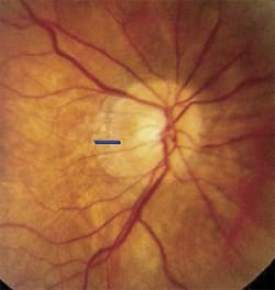 Fig. 5. Focal loss of the retinal nerve fiber layer associated with early atrophy of the inferior neuroretinal rim in a patient with primary open angle glaucoma