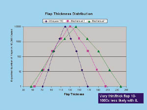I compared my results for about 350 consecutive eyes evenly divided among three keratomes: The Moria MII, the hand-guided Moria LSKI and the IntraLase. The IntraLase flaps were closest to the intended thickness, and the standard deviation and range for the mechanical microkeratomes were about double that of the IntraLase. I also found that the mechanical microkeratomes were 10 times more likely to produce a seriously thin flap and 1,000 times more likely to create extremely thick flaps (see "Flap Thickness Distribution").