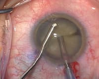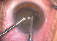 | In bimanual microincision cataract surgery, the infusion chopper/aspiration needle and the phacoemulsification needle/aspiration needle can be passed through either incision port, permitting access to difficult-to-reach spaces. | |
