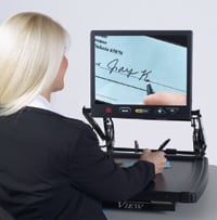 Vision Technology, Inc. introduces The View video magnifier for use by people of any age. The View provides battery powered closeup and distance magnification and tabletop viewing in a completely collapsible, portable CCTV. The View delivers performance, style and functionality together in an advanced video magnification product. The ability to turn the camera 360� on a horizontal plane and 240� on a vertical plane, along with the ability to raise and lower the monitor and controls, from the X-Y table up to 14-1/2", allows each user to customize the configuration that is right for their viewing needs.