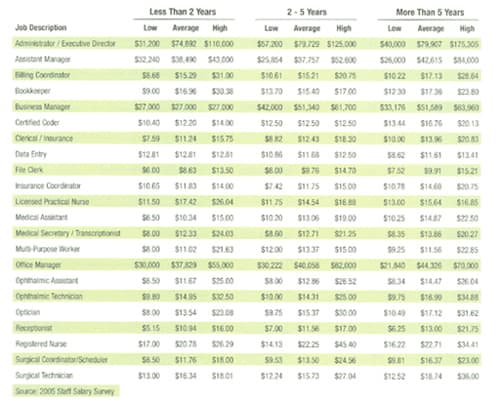 Nonprovider personnel cost continues to be the highest expense item for most ophthalmology practices, often comprising more than 65% of total practice overhead. The 2005 Staff Salary Survey, just published by The Health Care Group, located in Plymouth Meeting, Pa., gives you hard data for comparing and structuring your staff's compensation. Below are the national averages for ophthalmology practices as reported in the 2005 Staff Salary Survey.