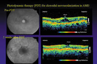 Verteporfin PDT has played a critical role as a long awaited new modality to treat CNV in exudative AMD with specified features and pathologic myopia. It may also be able to treat other disorders with subfoveal CNV that lack any treatment options, although it has not specifically been approved for other indications. Based on its mechanism of action, further investigation of PDT to treat other causes of ocular neovascularization or subtypes of exudative AMD may be indicated. The ability to enhance the effectiveness of PDT by varying verteporfin treatment parameters or by combination with other agents, such as corticosteroids, requires further investigation. Continued research and therapeutic developments for AMD will lead to more options for treating individuals with this common and potentially visually devastating disorder.
