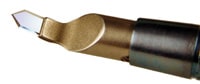 Surgeons are finding diamond knives superior to disposable metal blades for small-incision surgery. Pictured above is an Accutome diamond knife. An assortment of the company's Mani line of metal blades are pictured on the bottom. |