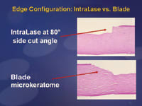 Another advantage of using the IntraLase is that the thickness is the same across the entire flap (Figure 2). I believe that this feature is responsible for minimizing flap-induced refractive effects and higher-order aberrations such as coma and trefoil. Also, the edge of the flap can be cut more vertically (Figure 3). I use a 70Þ to 80Þ side cut angle so that the flap fits in the bed like a manhole cover and is less likely to be displaced by minor trauma during the early postoperative period. This vertical edge cut may be responsible for my observation of the absence of clinically significant epithelial ingrowth (more than 0.25 mm) either after primary LASIK or enhancements. We take advantage of this effect in enhancements of previous blade microkeratome-created flaps. I use the IntraLase to make a 70Þ vertical edge cut of only 0.3 mm inside the old flap edge and then lift the flap and perform the retreatment. This maneuver tends to decrease the risk of epithelial ingrowth following enhancements and allows the edge to heal more firmly than with a beveled-blade microkeratome, decreasing the risk of late traumatic flap displacement.