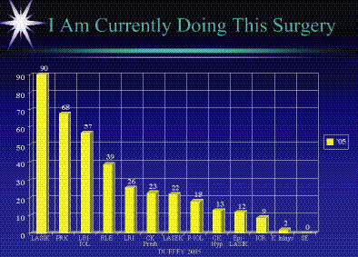 About this data: A mailing to 1,500 U.S. members of ISRS/AAO was sent out and 246 responses were analyzed by Oct. 1, 2005 (16.4% of the U.S. ISRS/AAO membership). This is the ninth year of refractive data collection. This data may be found in its entirety on Dr. Duffey's Web site at www.duffeylaser.com/physicians_resources.php.
