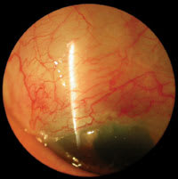 The patient underwent an ExPress R-50 shunt to the right eye on Feb. 24, 2005 with 2 minutes of MMC and two releasable sutures. This was accomplished with a combination of intracameral 1% non-preserved lidocaine, 2% lidocaine jelly and subconjunctival 1% non-preserved lidocaine on a 27-gauge cannula in the superotemporal quadrant, where the conjunctiva was mobile. On the first day postop, IOP was 17 mm Hg and vision 20/70 OD. One week postop, vision was 20/30, IOP was 15 mm Hg and steroids were reduced to q.i.d. Antibiotics were stopped and NSAID decreased to b.i.d.