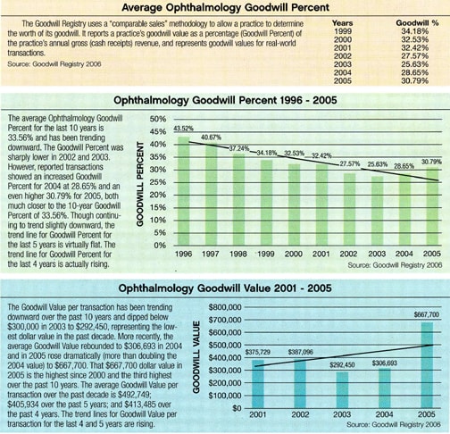 The information below, drawn from the 2006 Goodwill Registry, continues to confirm that ophthalmology goodwill though still trending downward is still quite viable, and that ophthalmology practices are one of the most valuable of all medical specialties.