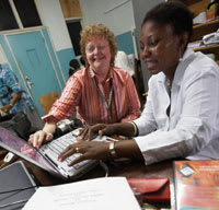 Roz Stevens, M.D., a volunteer retinal surgeon for ORBIS International, helps establish a telemedicine program at Muhimbili Hospital in Tanzania. |